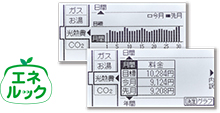 ガス、お湯、家中の電気使用量※や光熱費の目安、CO2排出量をグラフで表示します。