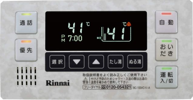 「通話」ボタンひとつで浴室と台所のリモコン間で会話ができるインターホン機能。毎日の入浴時に便利なだけでなく、これからの高齢社会に安心感を届ける機能として、リンナイはインターホン機能付きリモコンをおすすめします。